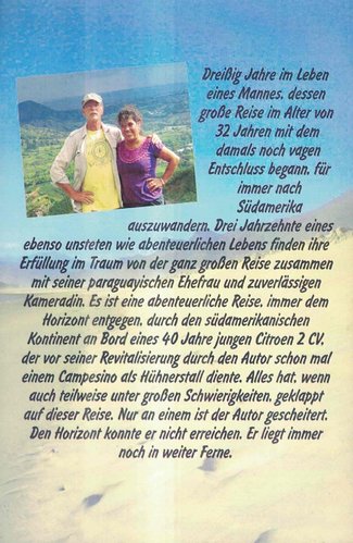 Dreißig Jahre im Leben eines Mannes, dessen große Reise im Alter von 32 Jahren mit dem damals noch vagen Entschluss begann, für immer nach Südamerika auszuwandern. Drei Jahrzehnte eines ebenso unsteten wie abenteuerlichen Lebens finden ihre Erfüllung im Traum von der ganz großen Reise zusammen mit seiner paraguayischen Ehefrau und zuverlässigen Kameradin. Es ist eine abenteuerliche Reise, immer dem Horizont entgegen, durch den südamerikanischen Kontinent an Bord eines 40 Jahre jungen Citroen 2CV, der vor seiner Revitalisierung durch den Autor schon mal einem Campesion als Hühnerstall diente. Aless hat, wenn auch teilweise unter großen Schwierigkeiten, geklappt auf dieser Reise. Nur an einem ist der Autor gescheitert. Den Horizont konnte er nicht erreichen. Er liegt immer noch in weiter Ferne.